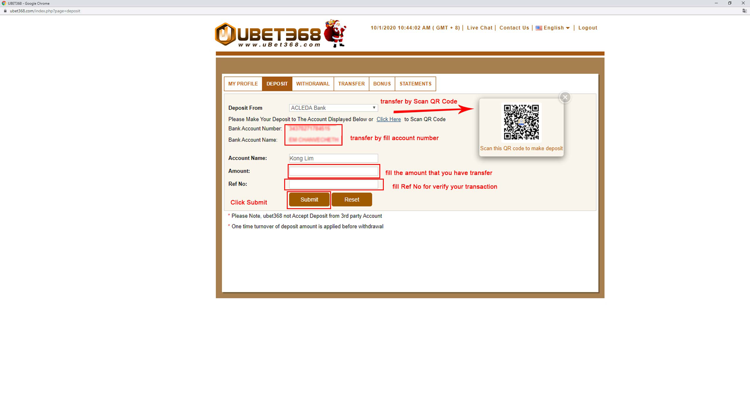 6.Click Submit and wait for 1minute you will received fund into you uBet368 account after company verify your submit information it matched with your transfer detail.