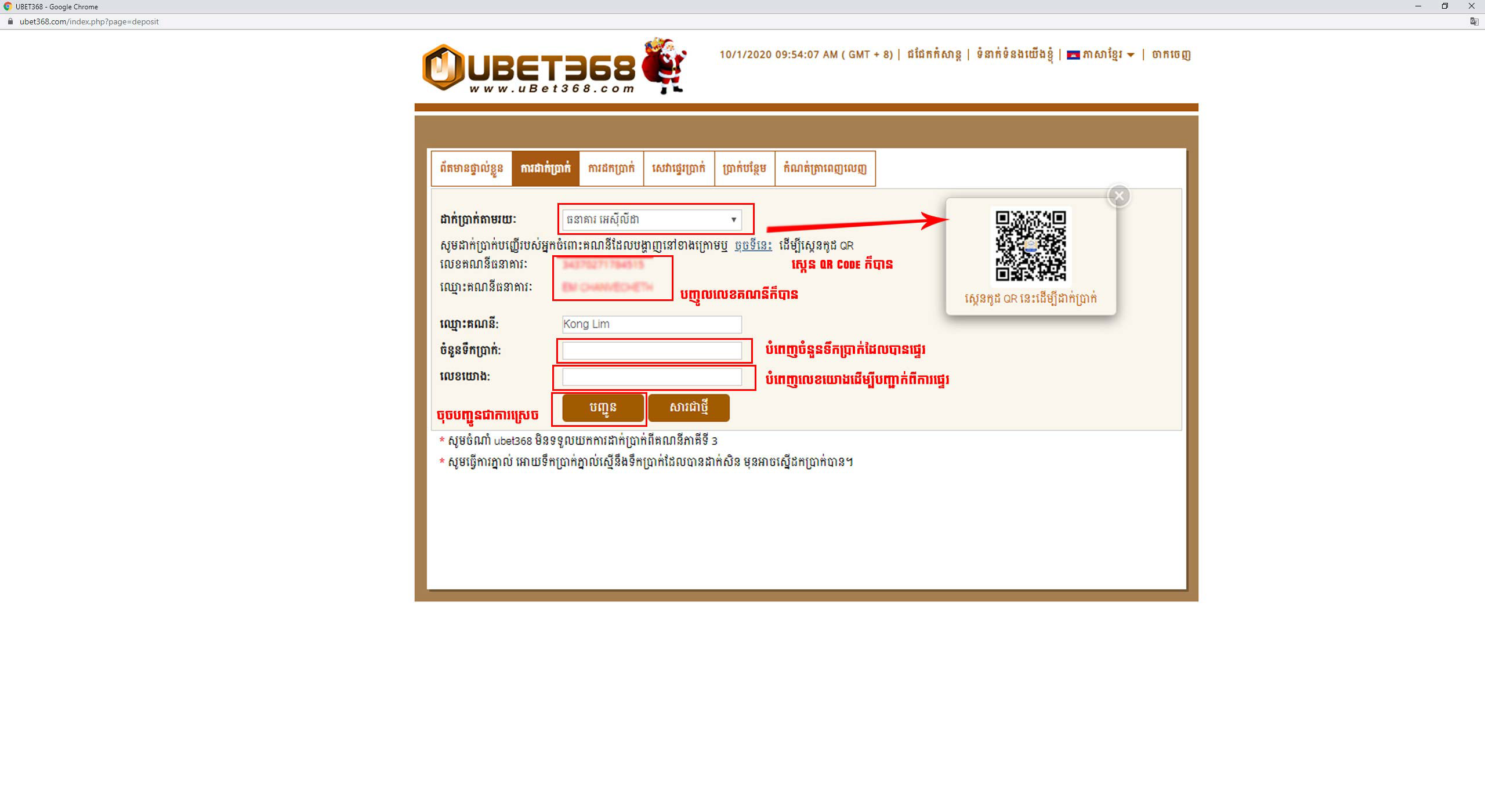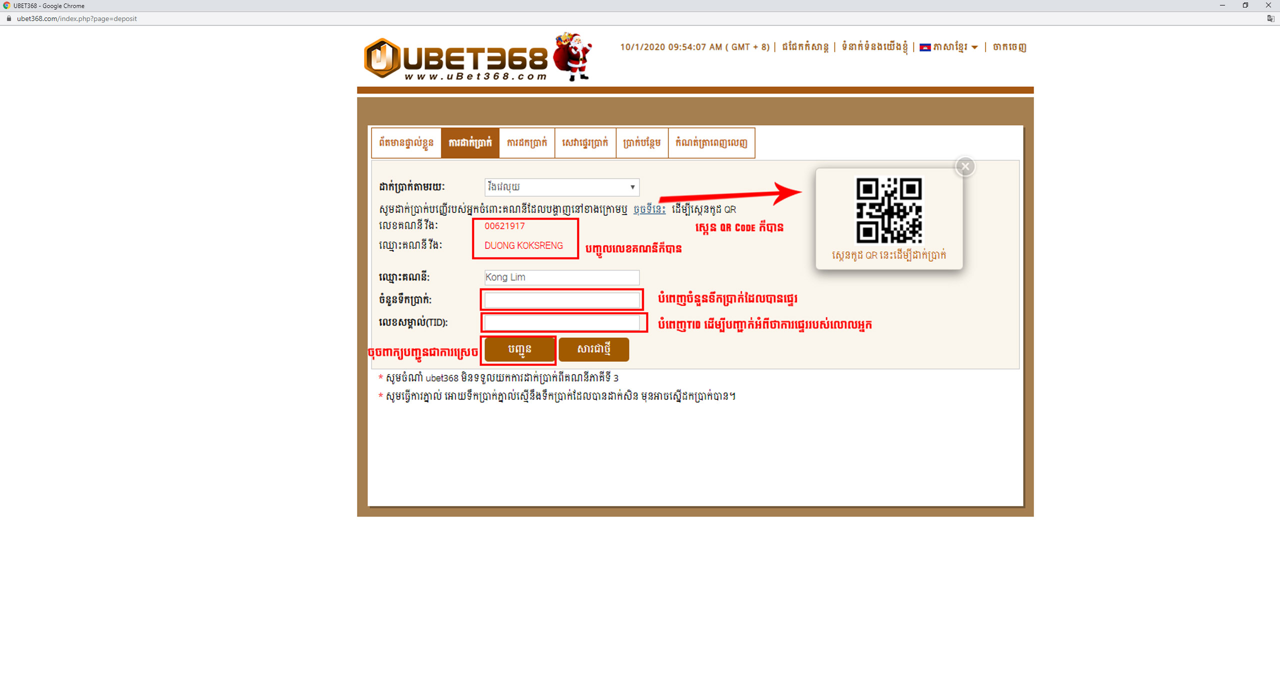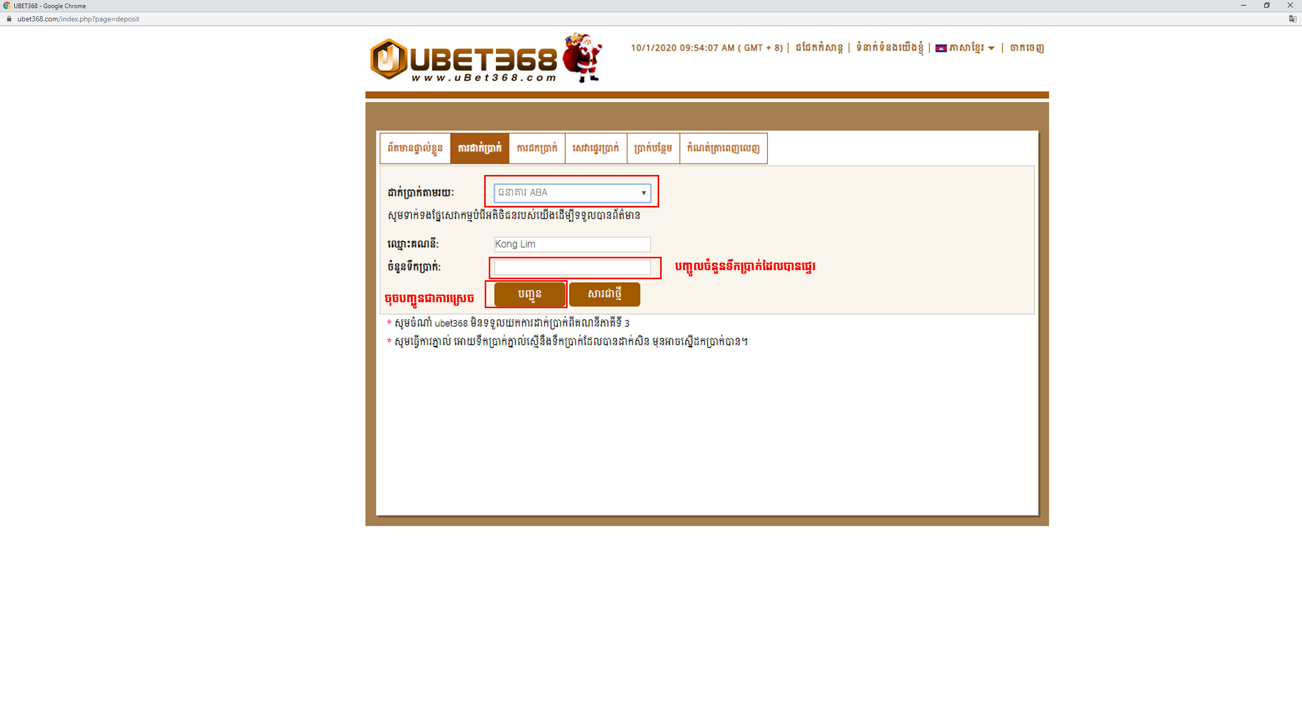 ដើម្បីដាក់ប្រាក់ជាមួយ​ uBet368 សូមធ្វើតាមការណែនាំដូចខាងក្រោម